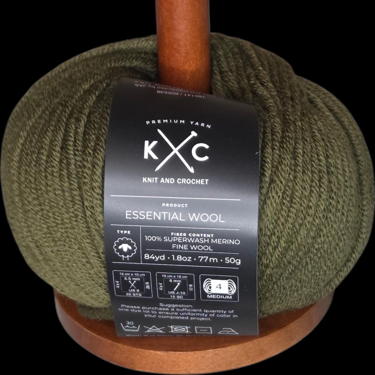 1 skein of K&C Essential Wool yarn in the color Green Olive. This yarn is made of 100% Superwash Merino Fine Wool and is in a classic ball shape. It is a medium weight yarn, perfect for various knitting and crocheting projects. The yarn is from the Essential Wool product line, known for its high quality and softness. This color adds a beautiful and unique touch to any project, making it a versatile and essential addition to any crafters' stash.