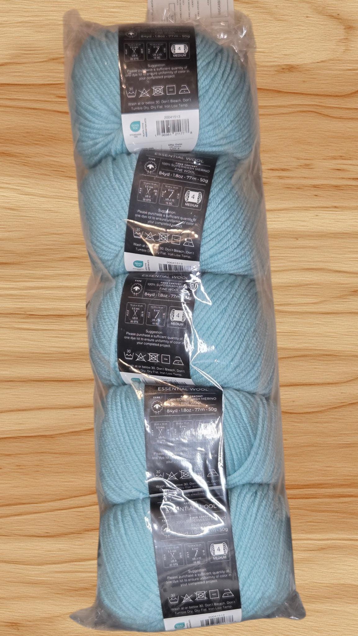 5 skeins of K&C Essential Wool yarn in the color Aqua Mist. This yarn is made of 100% Superwash Merino Fine Wool and is in a classic ball shape. It is a medium weight yarn, perfect for various knitting and crocheting projects. The yarn is from the Essential Wool product line, known for its high quality and softness. This color adds a beautiful and unique touch to any project, making it a versatile and essential addition to any crafters' stash.