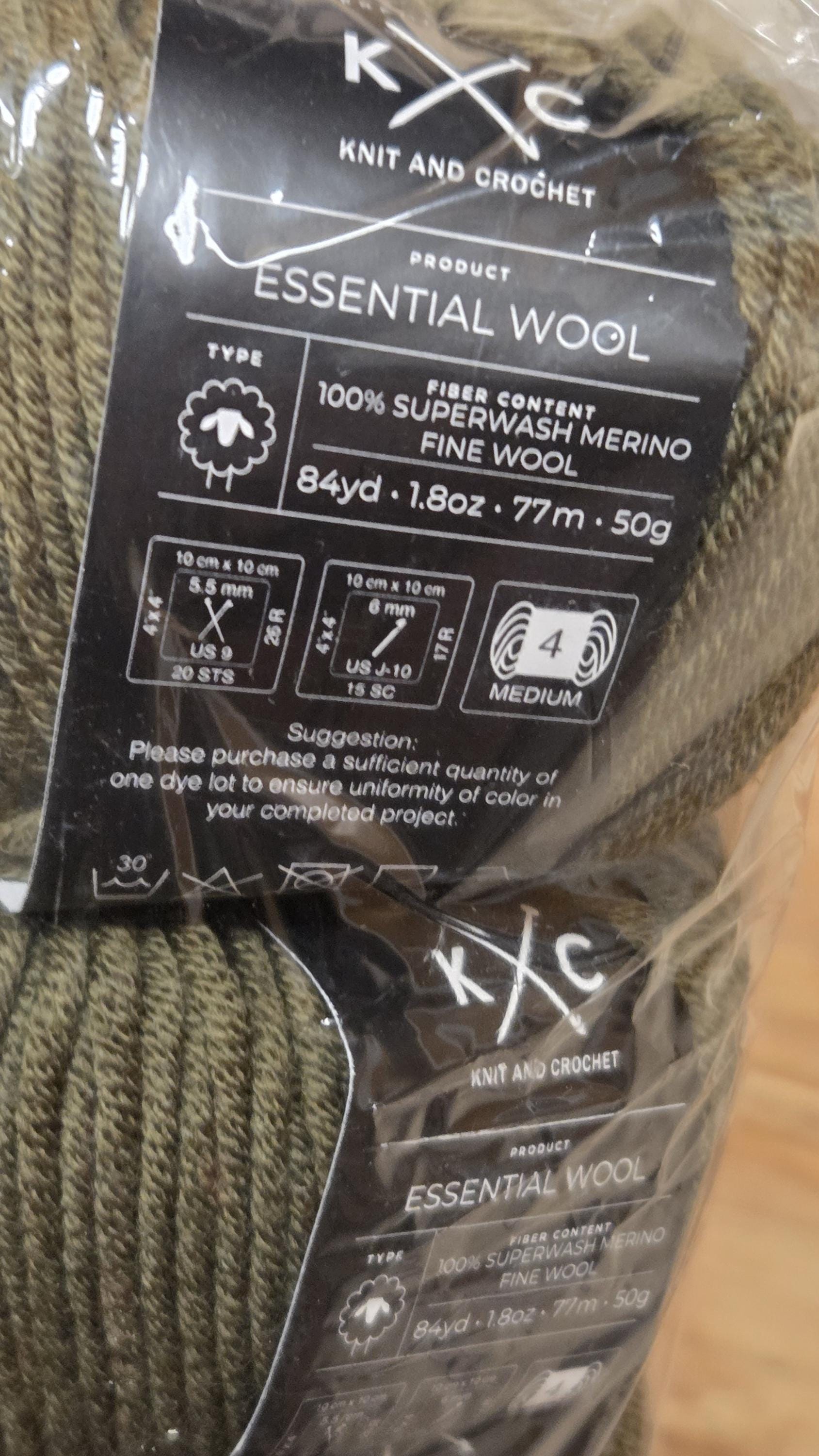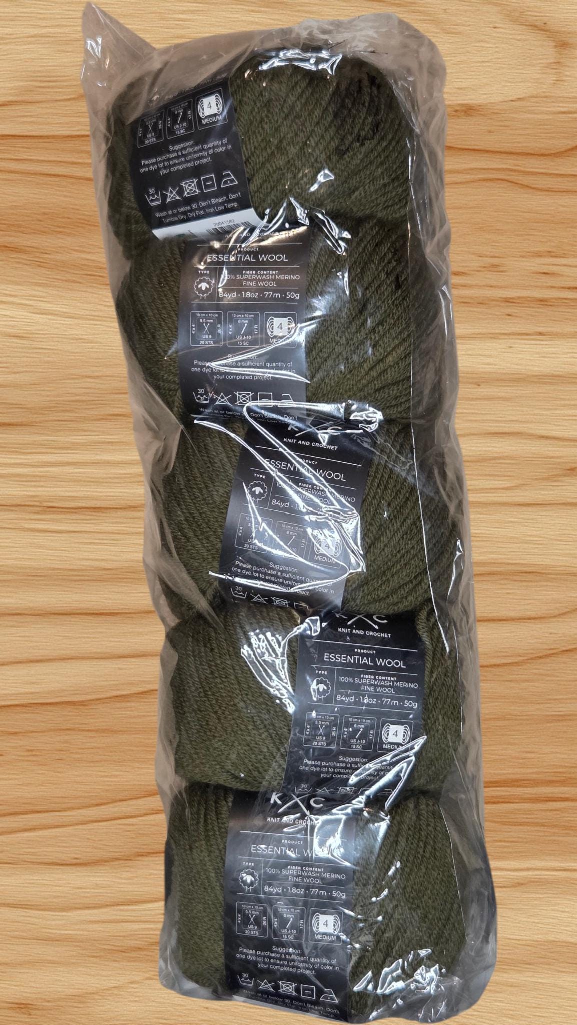 5 skeins of K&C Essential Wool yarn in the color Green Olive. This yarn is made of 100% Superwash Merino Fine Wool and is in a classic ball shape. It is a medium weight yarn, perfect for various knitting and crocheting projects. The yarn is from the Essential Wool product line, known for its high quality and softness. This color adds a beautiful and unique touch to any project, making it a versatile and essential addition to any crafters' stash.